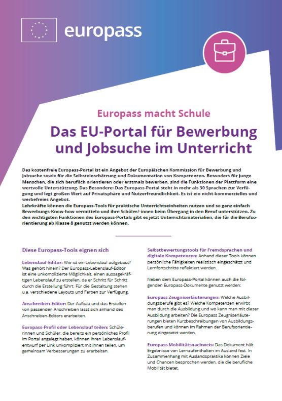Das kostenfreie Europass-Portal ist ein Angebot der Europäischen Kommission für Bewerbung und Jobsuche sowie für die Selbsteinschätzung und Dokumentation von Kompetenzen. Lehrkräfte finden im Europass-Portal zahlreiche Tools, die sie für praktische Unterrichtseinheiten nutzen können.